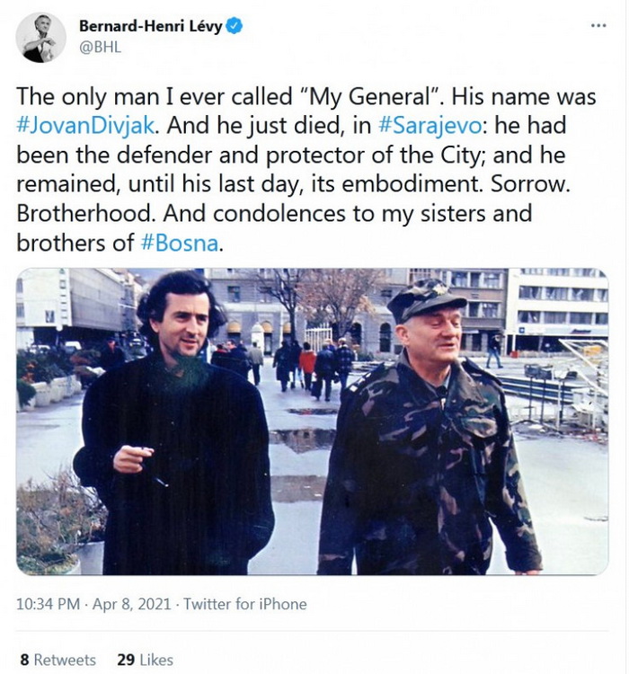 - Jedina osoba koju sam ikad nazvao „moj general“ zvao se Jovan Divjak. I upravo je umro, u Sarajevu. Bio je branitelj i zaštitnik grada i ostao je, sve do svog posljednjeg dana. Tuga. Bratstvo. I saučešće mojim sestrama i braći iz Bosne - napisao je Levy na Twitteru uz zajedničku fotografiju s Divjakom iz Sarajeva.