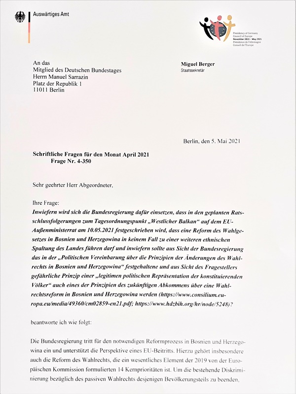 Democratization Policy Council (DPC) objavio je na svom Twitter profilu zvaničan, pisani, javni stav Njemačke vlade po ovom pitanju, kao odgovor na parlamentarno pitanje zastupnika Zelenih u Bundestagu Manuela Sarrazina u vezi s aktuelnim pregovorima o reformi izbornog zakona u BiH, pod vodstvom EU i SAD-a.