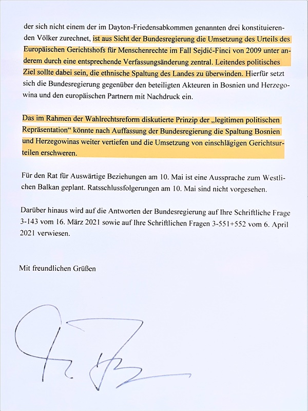 "Njemačka vlada mišljenja je da bi načelo 'legitimnog političkog predstavljanja', o kojem se raspravljalo u kontekstu izborne reforme, moglo dodatno produbiti podjelu BiH i zakomplikovati implementaciju relevantnih sudskih presuda. Ovo predstavlja izrazito distanciranje njemačke vlade od 3. mostarskog sporazuma u kojem su izloženi principi za izmjenu Izbornog zakona i odbacivanje političkog stava HDZ-a BiH", dodaje se u saopštenju.