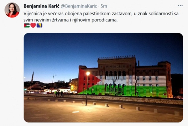 - Vijećnica je večeras obojena palestinskom zastavom, u znak solidarnosti sa svim nevinim žrtvama i njihovim porodicama - objavila je ispod fotografije Vijećnice gradonačelnica Sarajeva Benjamina Karić