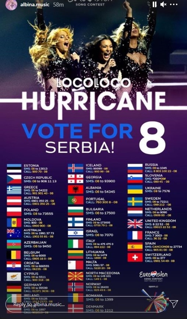 Nakon što je lajkala prolaz Finaca, Švicaraca i Srpkinja, 22-godišnja pjevačica još je jednom zaželjela sreću Srbiji te pozvala svoje fanove i pratitelje da glasaju za njih, piše Index.hr.