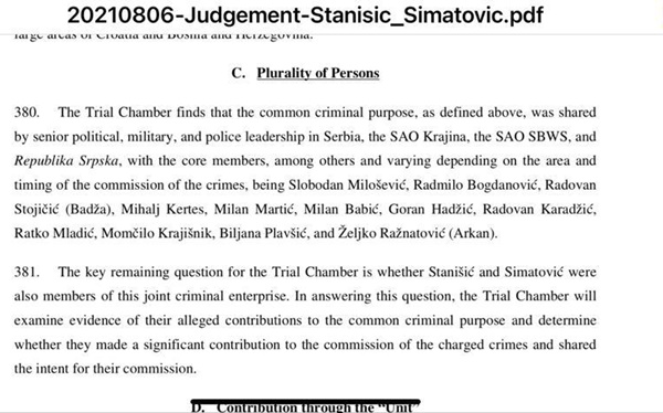 - Pretresno vijeće zaključuje da je zajednički zločinački cilj, kako je gore definisan, bio zajednički od strane visokog političkog, vojnog i policijskog rukovodstva u Srbiji, SAO Krajini, SAO SBZS i Republici Srpskoj, sa ključnim članovima, između ostalih i koja varira ovisno o području i vremenu izvršenja zločina, a to su: Slobodan Milošević, Radmilo Bogdanović, Radovan Stojičič (Badža), Mihalj Kertes, Milan Martić, Milan Babić, Goran Hadžić, Radovan Karadžić, Ratko Mladić, Momčilo Krajišnik, Biljana Plavšić i Željko Ražatović (Arkan).