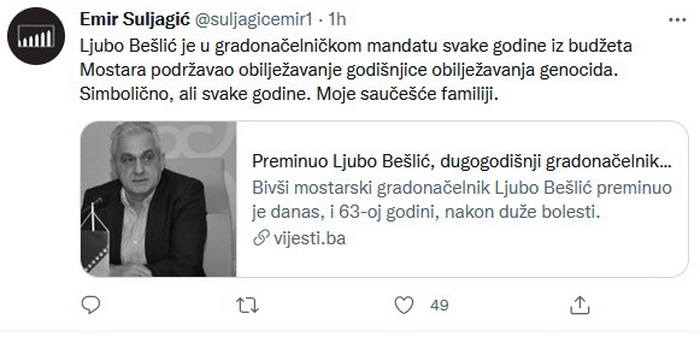 - Ljubo Bešlić je u gradonačelničkom mandatu svake godine iz budžeta Mostara podržavao obilježavanje godišnjice obilježavanja genocida. Simbolično, ali svake godine. Moje saučešće familiji, napisao je Suljagić.