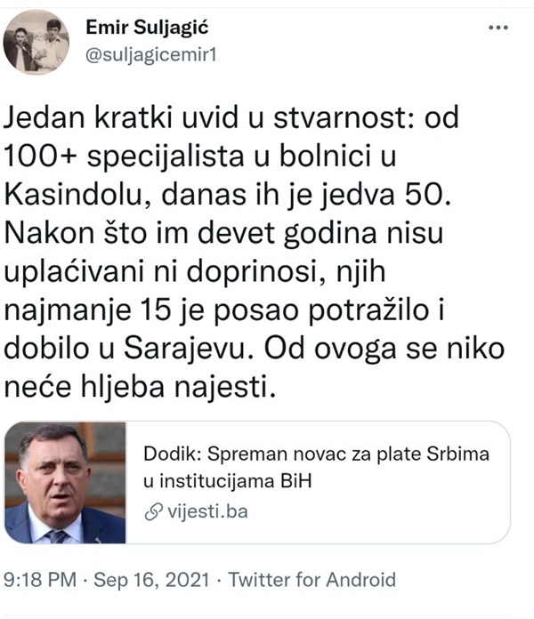 - Jedan kratki uvid u stvarnost: od 100+ specijalista u bolnici u Kasindolu, danas ih je jedva 50. Nakon što im devet godina nisu uplaćivani ni doprinosi, njih najmanje 15 je posao potražilo i dobilo u Sarajevu. Od ovoga se niko neće hljeba najesti, napisao je Suljagić.