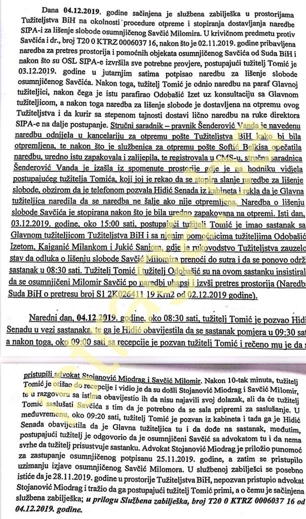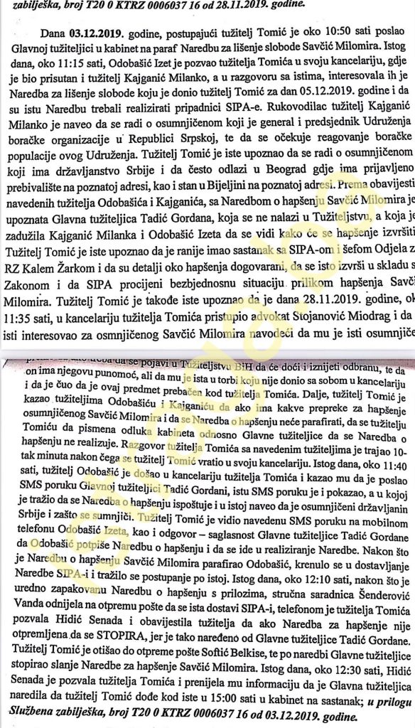 „Dana 3.12. 2019. godine, postupajući tužitelj Tomić je oko 10.50 sati poslao Glavnoj tužiteljici u Kabinet na paraf Naredbu za lišenje slobode Savčić Milomira. Istog dana, oko 11.15 sati, Odobašić Izet je pozvao tužitelja Tomića u svoju kancelariju gdje je bio prisutan i tužitelj Kajganić Milanko, a u razgovoru sa istima, interesovala ih je Naredba za lišenje slobode koju je donio tužitelj Tomić za dan 5. 12. 2019. godine i da su istu Naredbu trebali realizirati pripadnici SIPA-e“, navodi u svom Izvještaju postupajući tužilac Tomić.