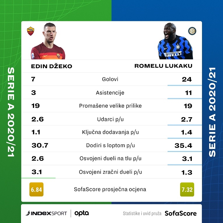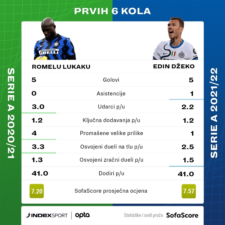 Ove brojke pokazuju da je Džeko i po ostalim statističkim parametrima neznatno bolji od Lukakua, uspoređujući njihove učinke nakon prvih šest kola ove i prošle sezone.