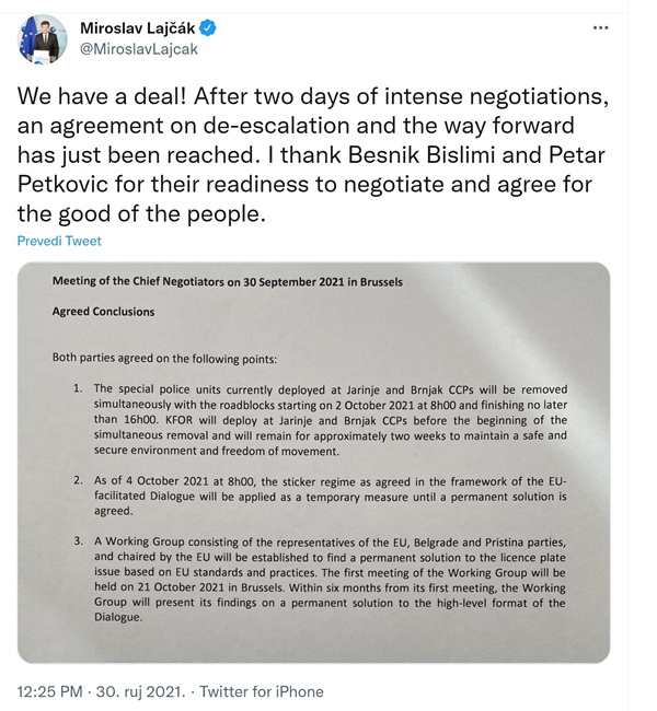 "Imamo dogovor. Nakon dva dana intenzivnih pregovora, sporazum o deeskalaciji i putu naprijed je upravo postignut", objavio je Lajčak uz fotografiju dokumenta.