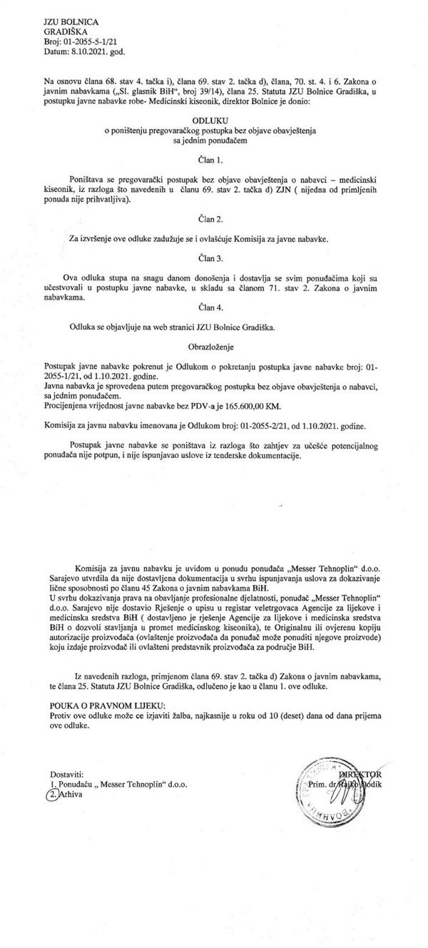 Inače, Bolnica Gradiška je 8. oktobra donijela odluku o poništenju pregovaračkog postupka za nabavku medicinskog kiseonika jer jedini trenutni snabdijevač ovim lijekom u BiH, kompanija Messer nije dostavila Rješenje o upisu u registar veletrgovaca Agencije za lijekove i medicinska sredstva i još nekoliko dokumenata traženih u pozivu.
