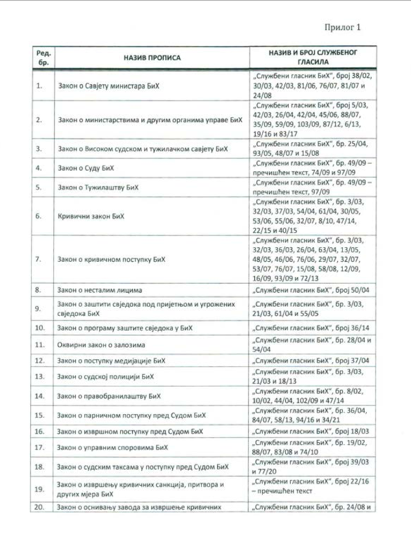 U dokumentu su navedeni svi pravni akti na osnovu kojih su uspostavljene nadležnosti na nivou Bosne i Hercegovine, a u tabeli koja je prilog ovoj Informaciji navedeno je 128 zakona i 114. drugih pravnih akata koja na državnom nivou reguliraju određene oblasti. Svi ti dokumenti trebali bi prestati da važe na teritoriji RS-a najkasnije šest mjeseci od usvajanja ove Informacije na Narodnoj skupštini Republike Srpske zakazanoj za sredinu novembra.