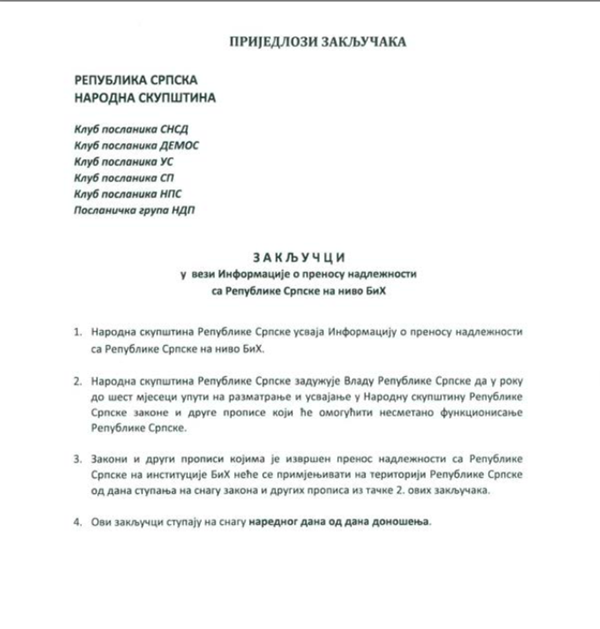 “Zakoni i drugi propisi kojima je izvršen prenos nadležnosti sa RS na institucije BiH neće se primjenjivati na teritoriji Republike Srpske od dana stupanja na snagu zakona i drugih propisa iz tačke 2 ovih zaključaka”, navedeno je u dokumentu.