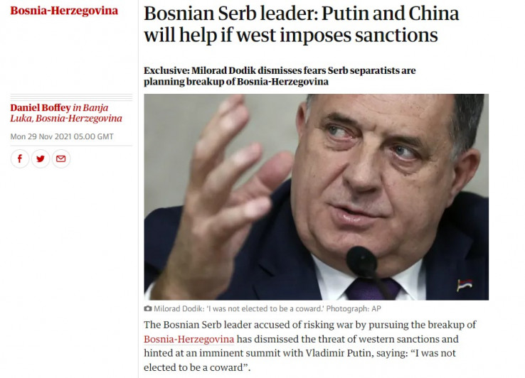 U intervjuu za The Guardian, Milorad Dodik, član tročlanog rukovodstva BiH, rekao je da ga neće spriječiti negodovanje Londona, Vašingtona, Berlina i Brisela.