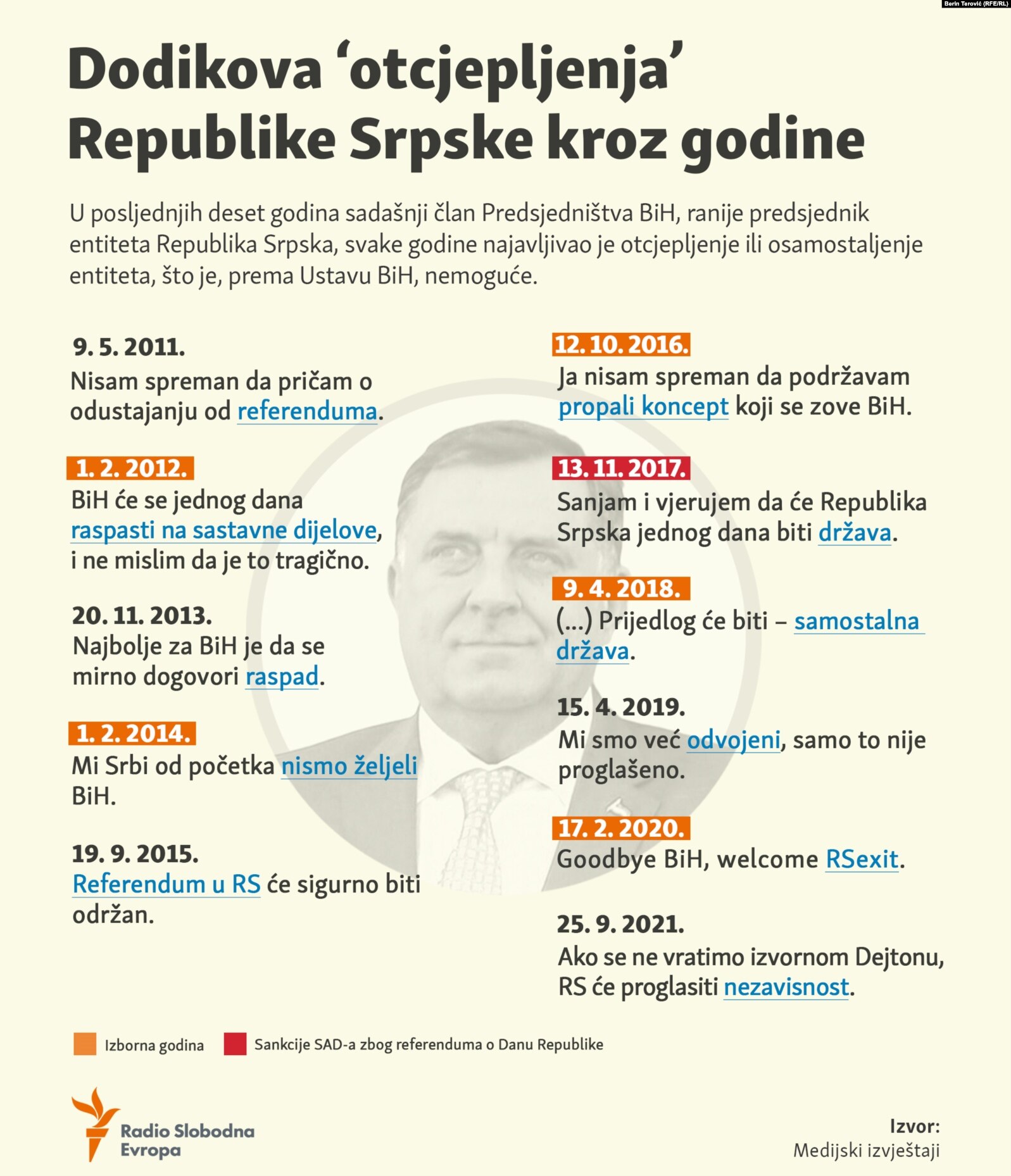 Ranije je najavljivao nikad održani referendum o nezavisnosti RS-a ili o ulasku BiH u NATO, ali i proveo neustavni referendum o 9. januaru kao “danu RS”, zbog kojeg je stavljen i na “crnu listu SAD-a”.