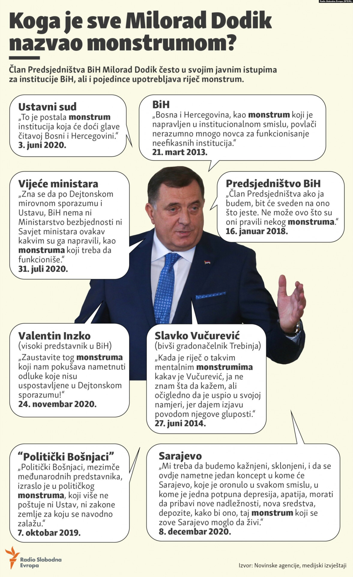 Dodik je označio OHR kao “monstruma koji nam pokušava nametnuti odluke mimo Daytona”, uz Ustavni sud BiH, Vijeće ministara i Predsjedništvo BiH čiji je član.