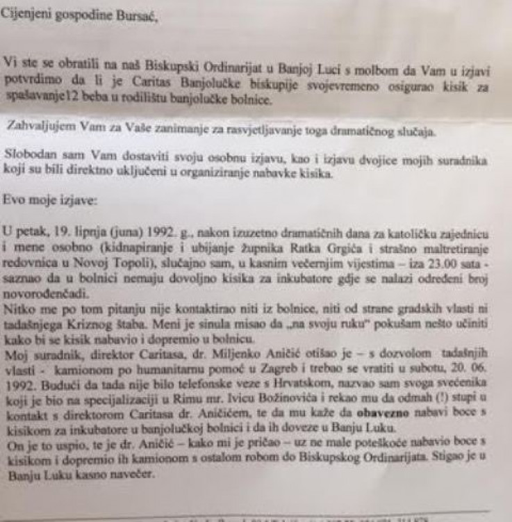 "Izjava kojom biskup banjalučki Franjo Komarica potvrđuje da je u Banju Luku u junu 1992. godine dopremljen kisik za bebe u inkubatorima. Ostaje nejasno zašto ga tadašnje srpske vlasti nisu upotrijebile i zašto su djeca žrtvovana", napisao je Bursać.