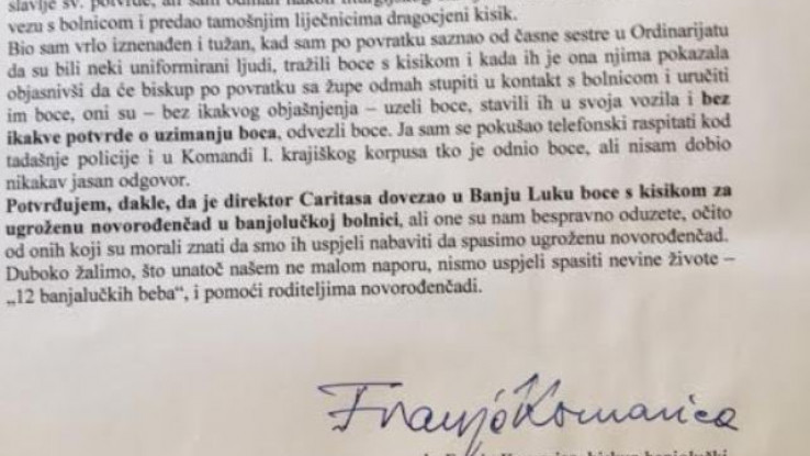 Potvrđujem, da je direktor Caritasa dovezao u Banju Luku boce s kisikom za ugroženu novorođenčad u banjolučkoj bolnici. Duboko žalimo što nismo uspjeli spasiti nevine živote, 12 banjalučkih beba i pomoći roditeljima novorođenčadi", navodi se na kraju izjave biskupa Franje Komarice.