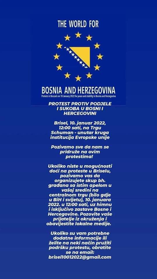 “Ponedjeljak, 10. januar je simbolički izabran jer je prvi pravi radni dan nakon praznika u 2022., a istovremeno i dan nakon obilježavanja protuustavnog, unilateralnog osnivanja tzv. ‘Srpske republike BiH’ 1992. godine. Manifestacija će se održati u Briselu, sjedištu institucija Evropske Unije. Pozivamo i naše građane širom svijeta da nam se pridruže i u svojim sredinama organizuju slične mitinge”, ističu.