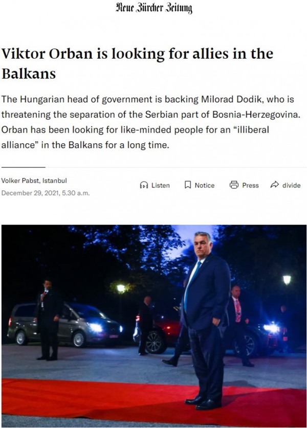 Švicarski dnevnik "Neue Zurcher Zeitung" ponovo je analizirao odnos člana Predsjedništva BiH Milorada Dodika i mađarskog premijera Viktora Orbana. Ovog puta analiza je objavljena pod naslovom "Orban traži saveznike na Balkanu".