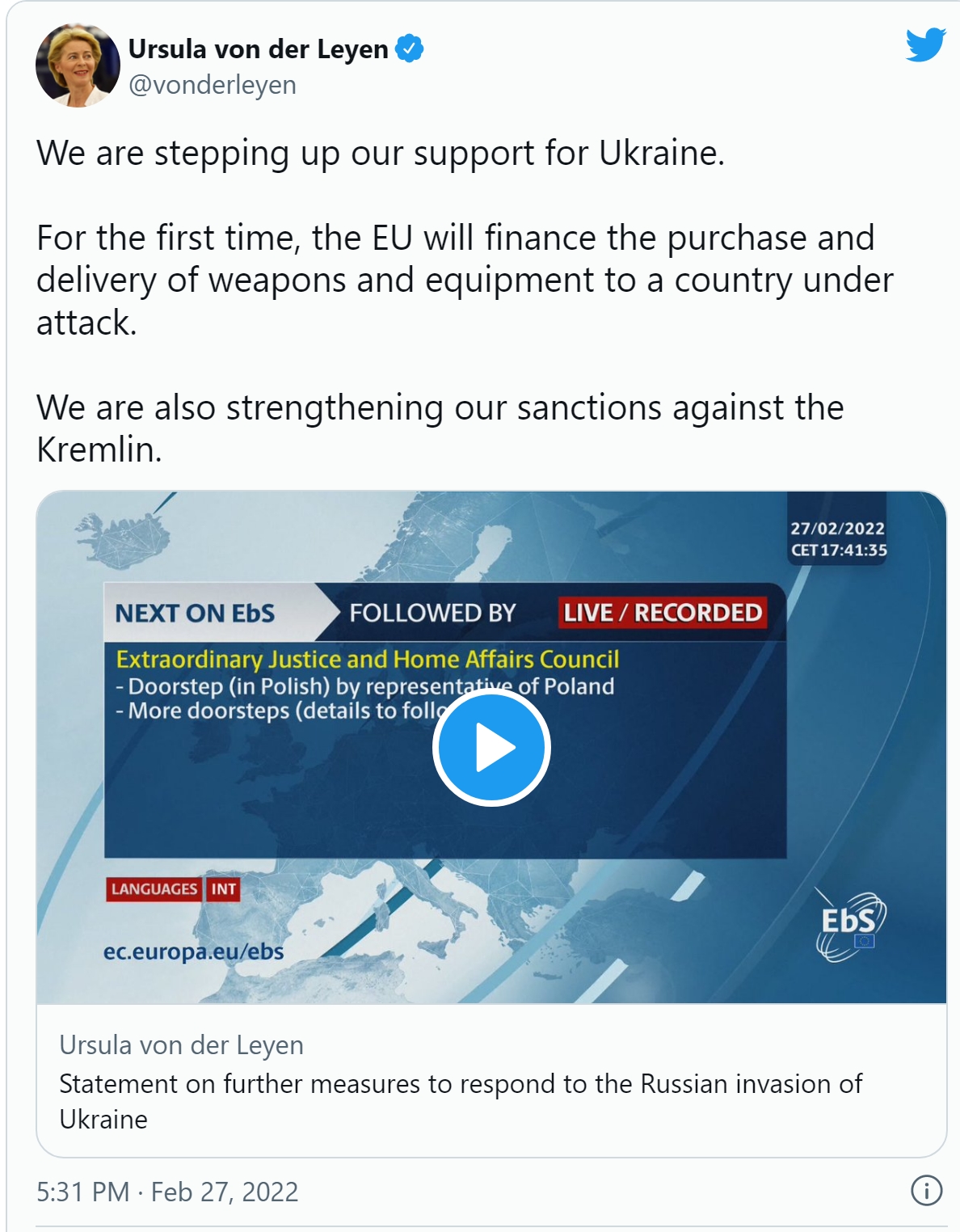 Predsjednica Evropske komisije Ursula von der Leyen na zvaničnom Twitter profilu objavila je nove informacije vezane za sankcije Rusiji zbog agresije na Ukrajinu.