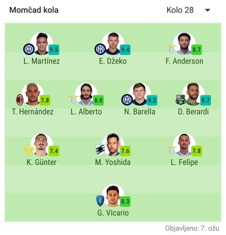 Osim fudbalera Intera u timu kola su još: Vicario (Empoli), Gunter (Verona), Yoshida (Sampdoria), Felipe (Lazio), Hernandez (Milan), Alberto (Lazio), Barella (Inter), Berardi (Sassuolo) i Anderson (Lazio).