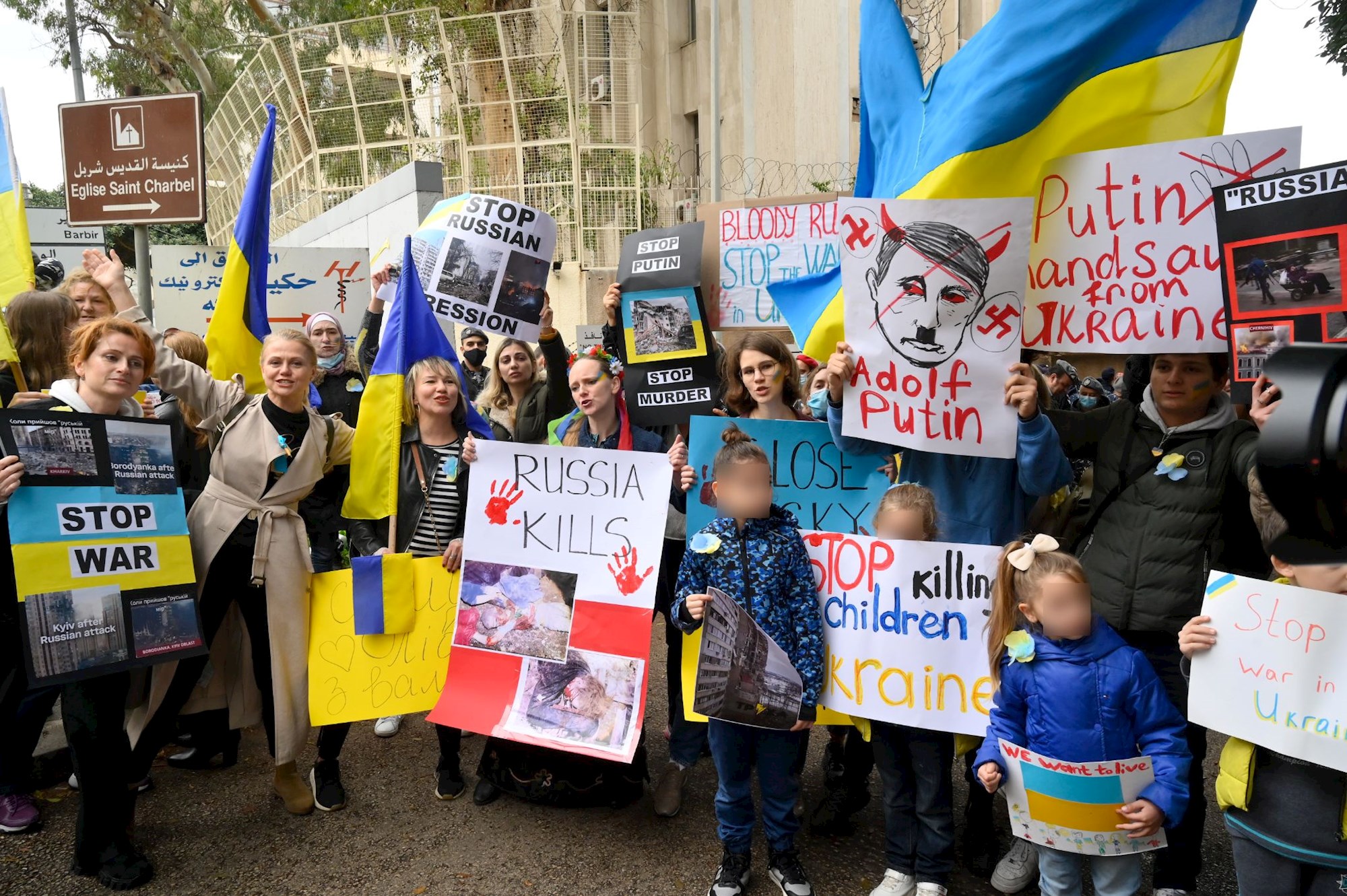 Također, danas su protesti bili i ispred ruske ambasade u Bejrutu. Ljudi su držali natpise poput "Rusija ubija", "prestanite ubijati djecu" i "Adolf Putin".