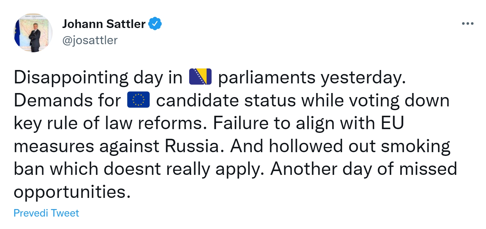 "Jučer razočaravajući dan u parlamentima. Zahtjevi za status kandidata za EU uz glasanje protiv ključnih reformi vladavine prava. Neusklađivanje s mjerama EU protiv Rusije. I izmijenjena zabrana pušenja koja se zapravo ne primjenjuje. Još jedan dan propuštenih prilika", napisao je Sattler na svom Twitter profilu.