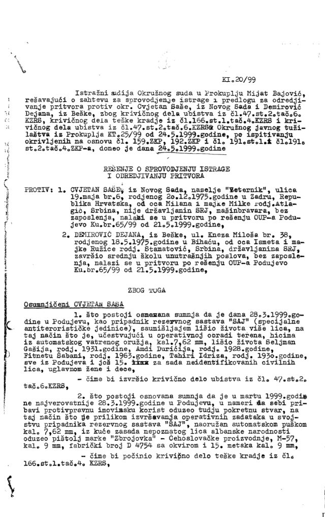 “Postoji osnovana sumnja da je Saša Cvjetan dana 28.3. 1999. godine u Podujevu, kao pripadnik rezervnog sastava “SAJ” (specijalne antiterorističke jedinice) s umišljajem lišio života više lica, na taj način što je, učestvujući u operativnoj obradi terena, hicima iz automatskog vatrenog oružja, kalibra 7,62 mm, lišio života Seljman Gašija (1931.), Amdi Durićija (1928), Fitnetu Šabani (1963.), Tahiri Idriza (1930.), svi iz Podujeva i još petnaest za sada neidentifikovanih civilnih lica, uglavnom žena i djece”, navedeno je rješenju o provođenju istrage istražnog sudije Okružnog suda u Prokuplju (Srbija).