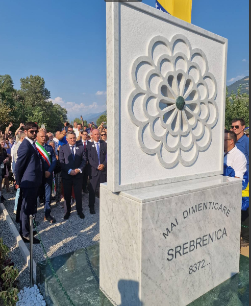 Član Predsjedništva BiH Željko Komšić, na poziv bh. Udruženja građana "Ljiljan Italija", otvorio je spomen-obilježje "Cvijet Srebrenice" u mjestu Rogno u Italiji, a u kojem žive građani bh. porijekla.