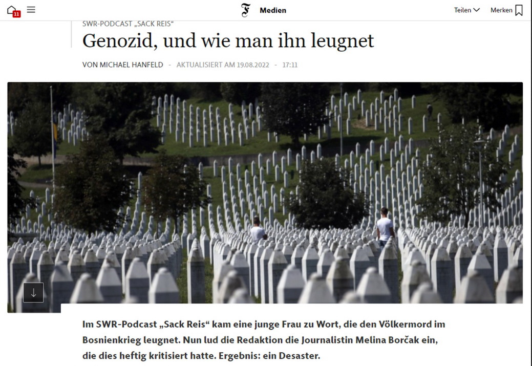 Kako piše urednik Frankfurer Allgemeine Zeitunga zadužen za online medije i feljtone Michael Hanfeld, sve je počelo gostovanjem mlade bosanske Srpkinje. Ona je u podkastu “Sack Reis” rekla da “ne želi znati ništa o genocidu u Srebrenici koji su srpske trupe počinile u Bosni i Hercegovini, odnosno, poriče međunarodno priznati genocid”.