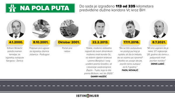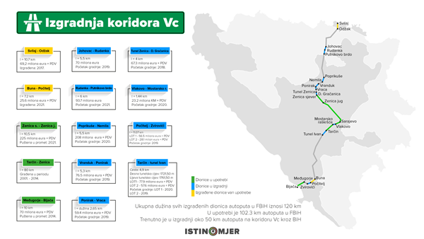 O Koridoru Vc Istinomjer je pisao u analizi objavljenoj u augustu prošle godine. Od početka izgradnje autoputa na ovom koridoru prije više od 20 godina, do sada je izgrađeno 113 od ukupnih 335 kilometara.