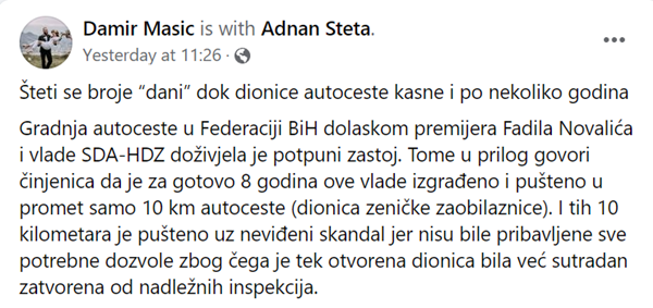 "Gradnja autoceste u Federaciji BiH dolaskom premijera Fadila Novalića i vlade SDA-HDZ doživjela je potpuni zastoj. Tome u prilog govori činjenica da je za gotovo 8 godina ove vlade izgrađeno i pušteno u promet samo 10 km autoceste (dionica zeničke zaobilaznice)."