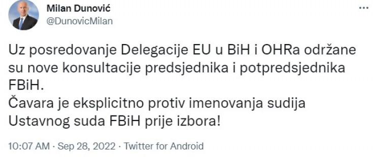 Potpredsjednik FBiH Milan Dunović (DF) saopćio je da je predsjednik ovog entiteta Marinko Čavara (HDZ) bio eksplicitno protiv imenovanja sudija Ustavnog suda FBiH prije izbora.