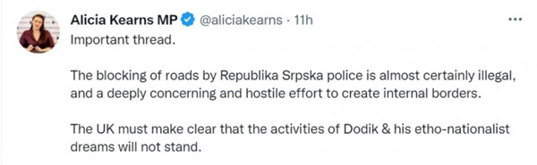 Predsjedavajuća Komiteta za vanjske poslove Donjeg doma britanskog Parlamenta Alicia Kearns upozorila je britansku i svjetsku javnost na opasne namjere predsjednika RS Milorada Dodika.