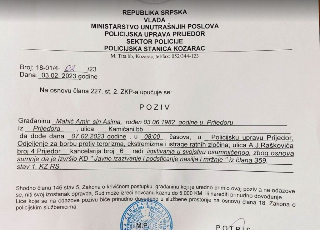 Policijska uprava Prijedora uputila je poziv na saslušanje glavnom imamu Medžlisa Islamske zajednice Kozarac Amiru ef. Mahiću, u svojstvu osumnjičenog.