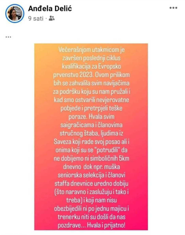 "Hvala svim saigračicama i članovima stručnog štaba, ljudima iz Saveza koji rade svoj posao, ali i onima koji su se 'potrudili' da ne dobijemo ni simboličnih 5 KM dnevno, dok npr. muška seniorska selekcija i članovi staffa, dnevnice uredno dobiju (što naravno zaslužuju i tako treba). Nisu nam obezbijedili ni po jednu majicu i trenerku, niti su došli da nas pozdrave. Hvala i prijatno", navodi se u statusu Anđele Delić.