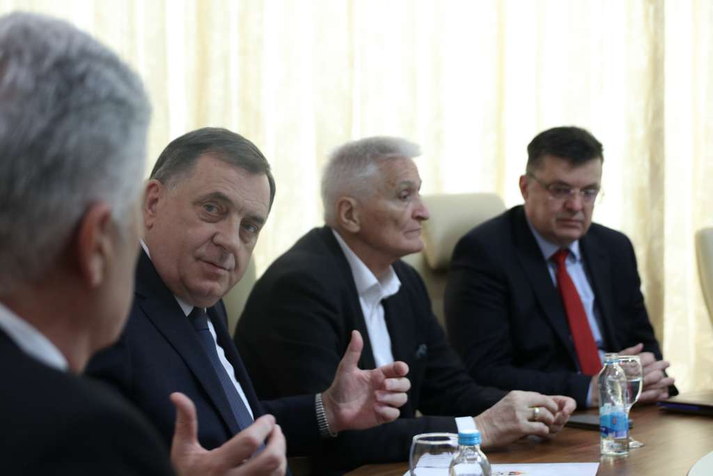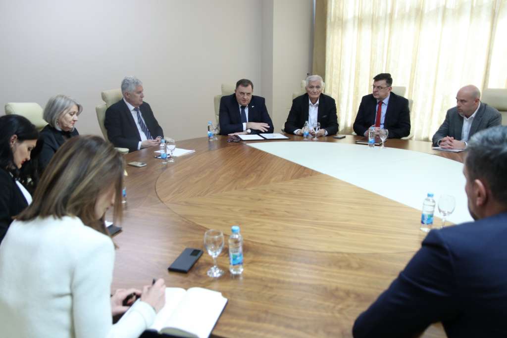 Sastanku prisustvuju predsjednik SNSD Milorad Dodik, ministar finansija u Vijeću ministara BiH Zoran Tegeltija, lider Naroda i Pravde Elmedin Konaković, predsjednik SDP-a BiH Nermin Nikšić i predsjedavajuća Vijeća ministara BiH Borjana Krišto.