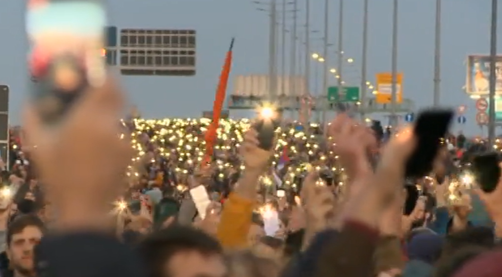 Demonstranti uzvikuju: "Vučiću, odlazi!". Na Gazeli je razvijen transparent "Srbija protiv nasilja".