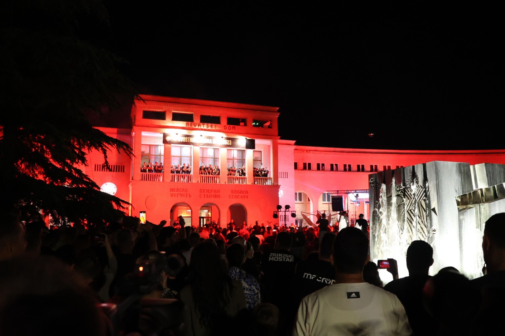 Historijski uspjeh kluba proslavljen je večeras na platou ispred Hrvatskog doma hercega Stjepana Kosače gdje su se najprije brojni navijači i simpatizeri slikali s peharima, nakon čega su Plemići trofeje podigli s balkona Kosače.