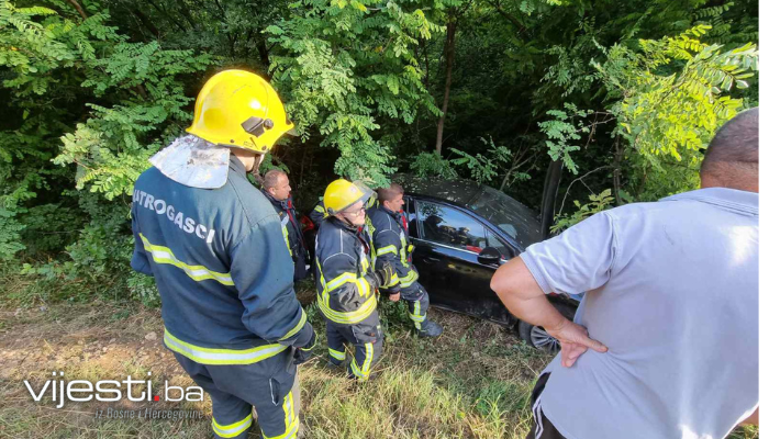 Vatrogasci pretražuju teren oko automobila koji je nakon udara u brdo i biciklistu završio u jarku.