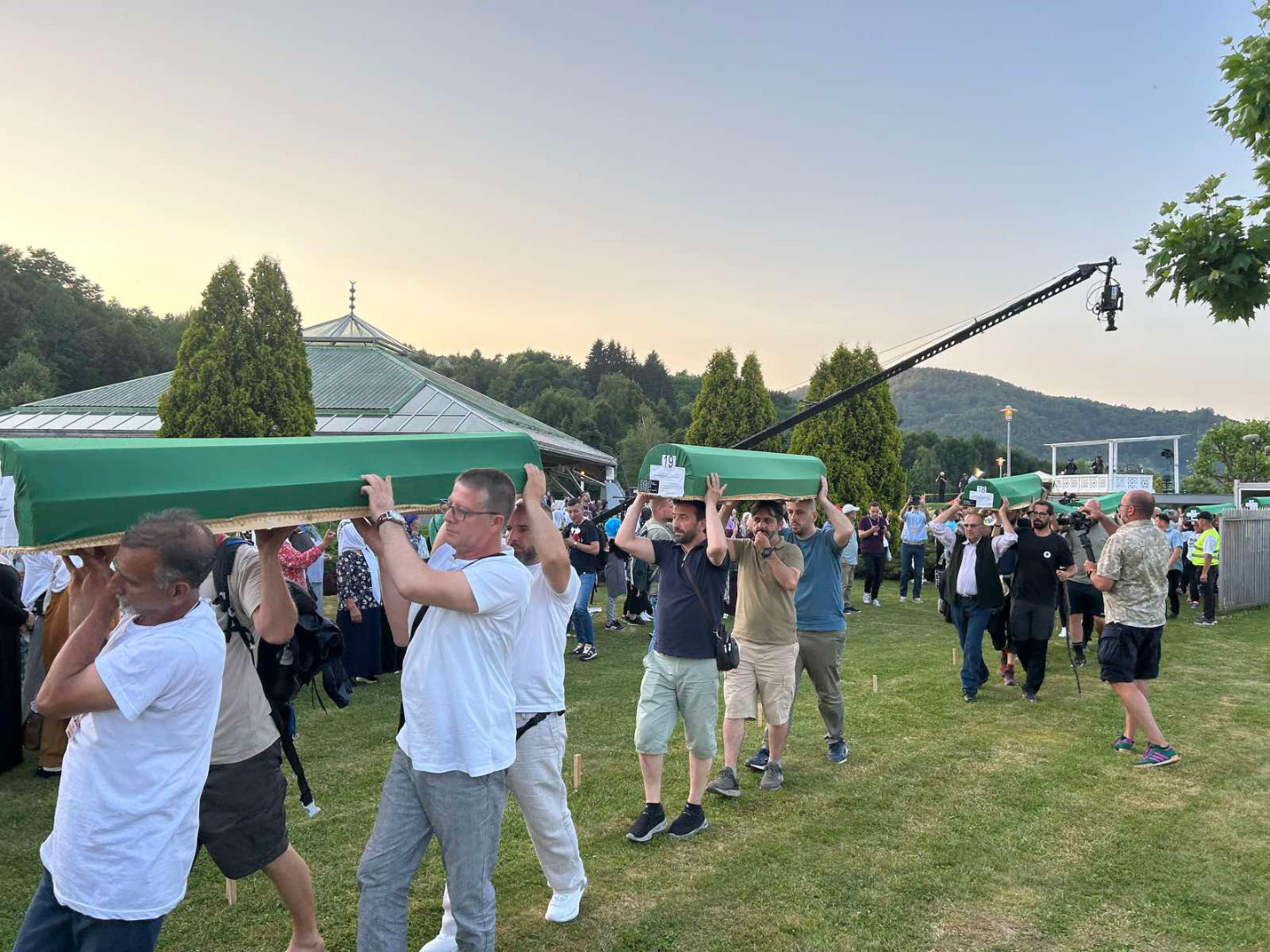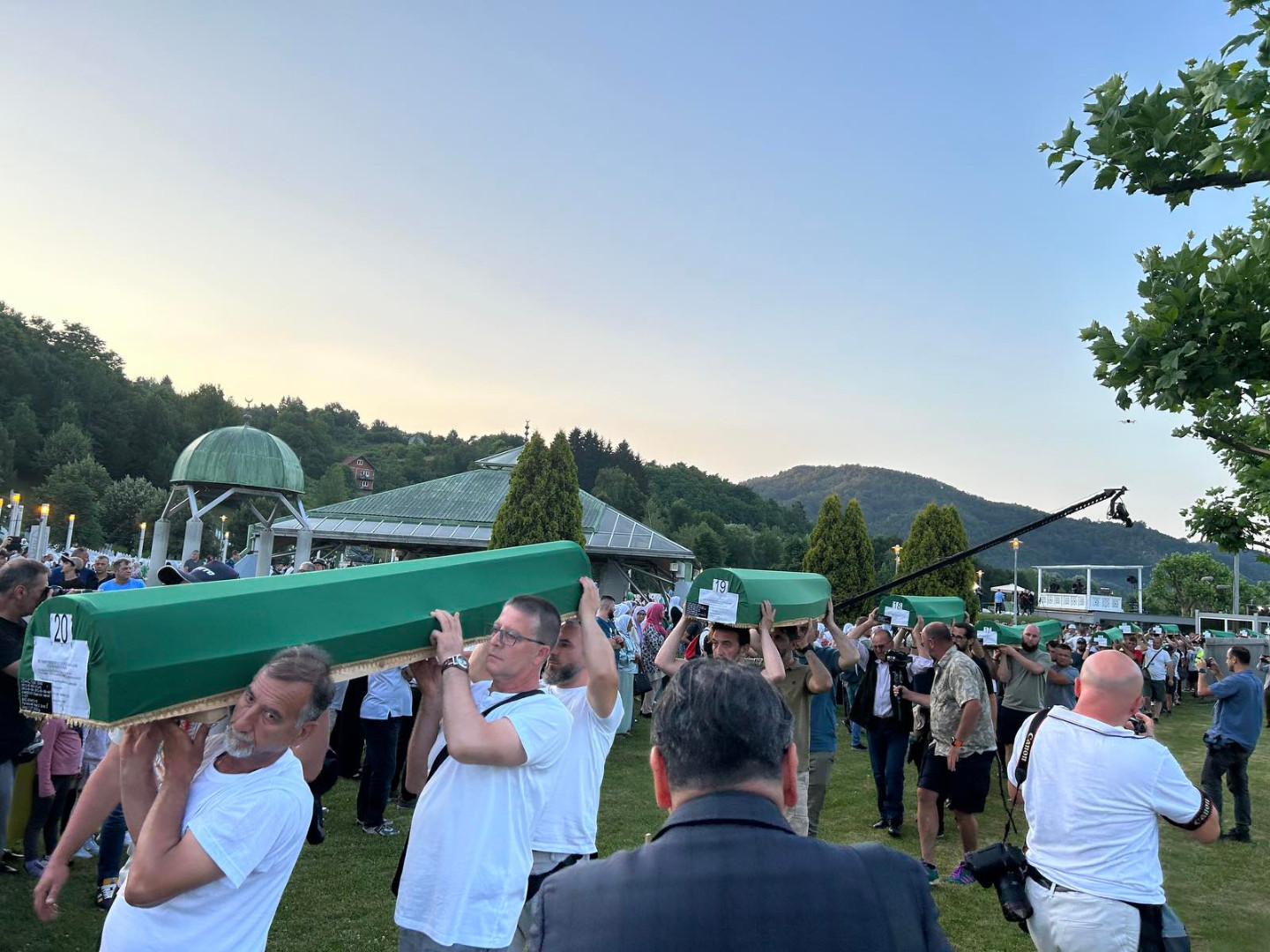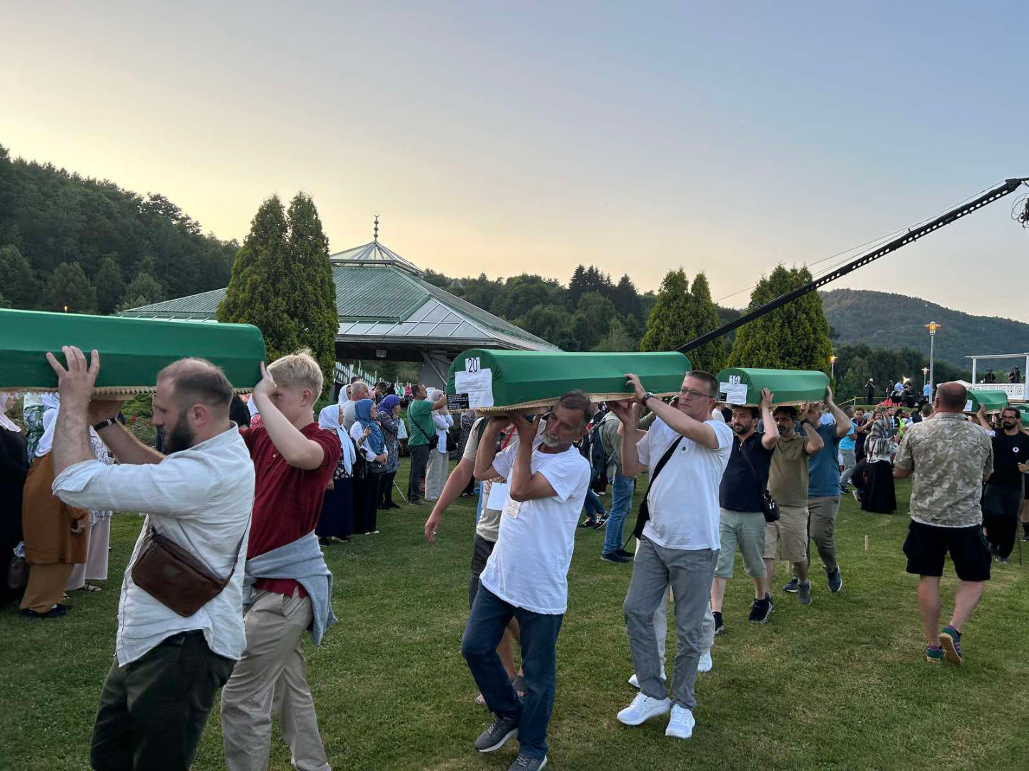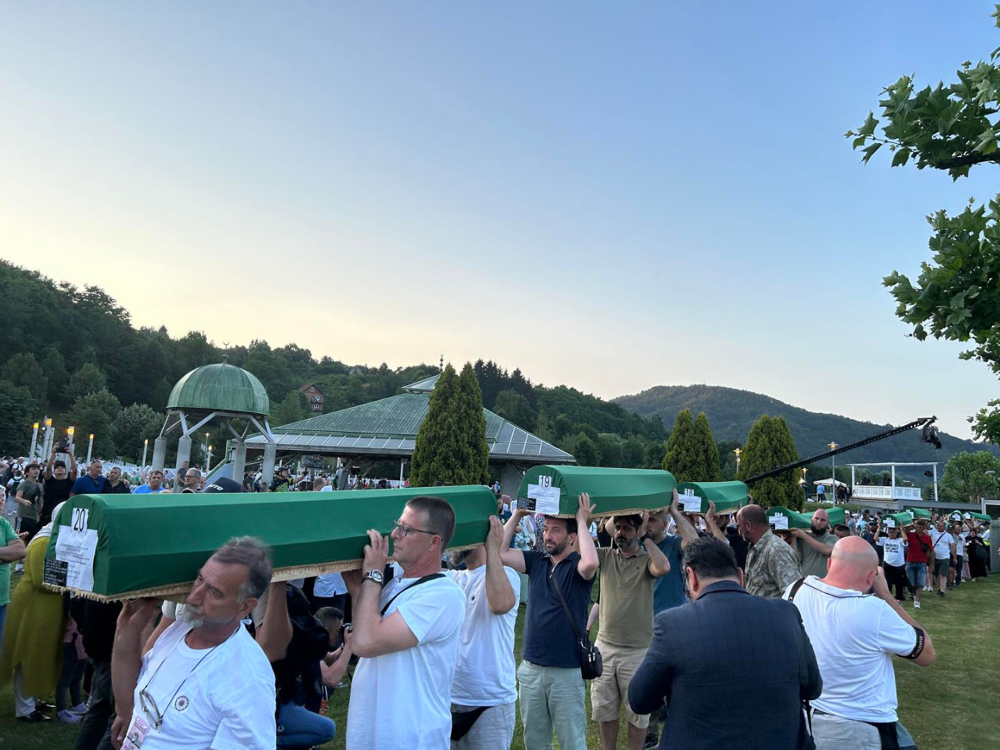 ... koji će sutra biti ukopani u Memorijalnom centru Potočari, večeras su izneseni iz prostora nekadašnje Fabrike akumulatora i preneseni do prostora musale Memorijalnog centra.