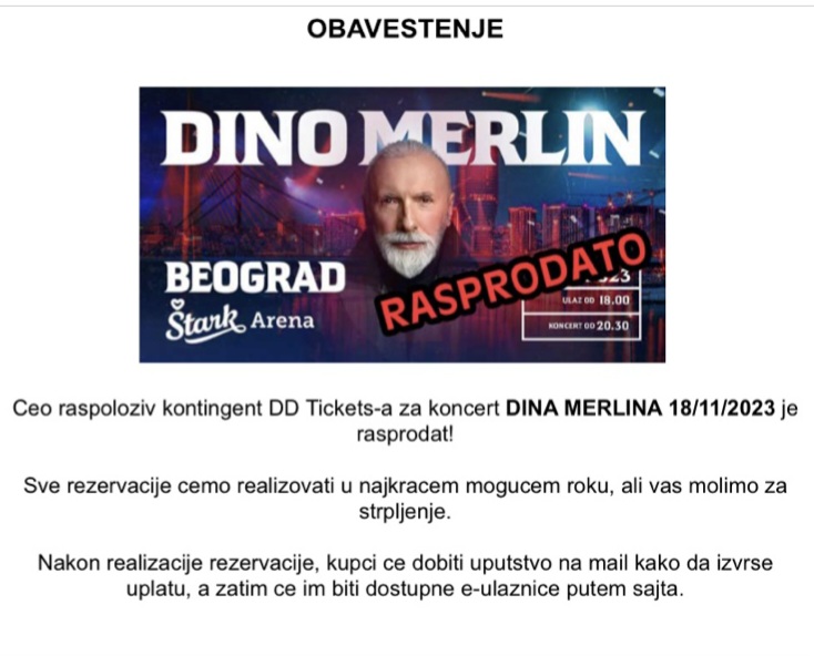 Karte su večeras online puštene u prodaju na stranici DD Ticekts i već su rasprodate. Ulaznice su najavljene i na platformi efinity ali tamo za sada još nema nikakvih obavještenja o prodaji.