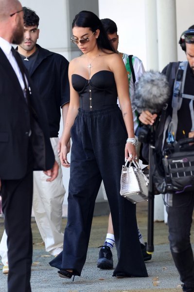 Georgina se pojavila u crnom jednostavnom izdanju. Odjenula je crni komplet, a gornji dio je korzet bez naramenica, a donji široke hlače, outfit je upotpunila luksuznom Hermes Birkin torbicom, piše Story.