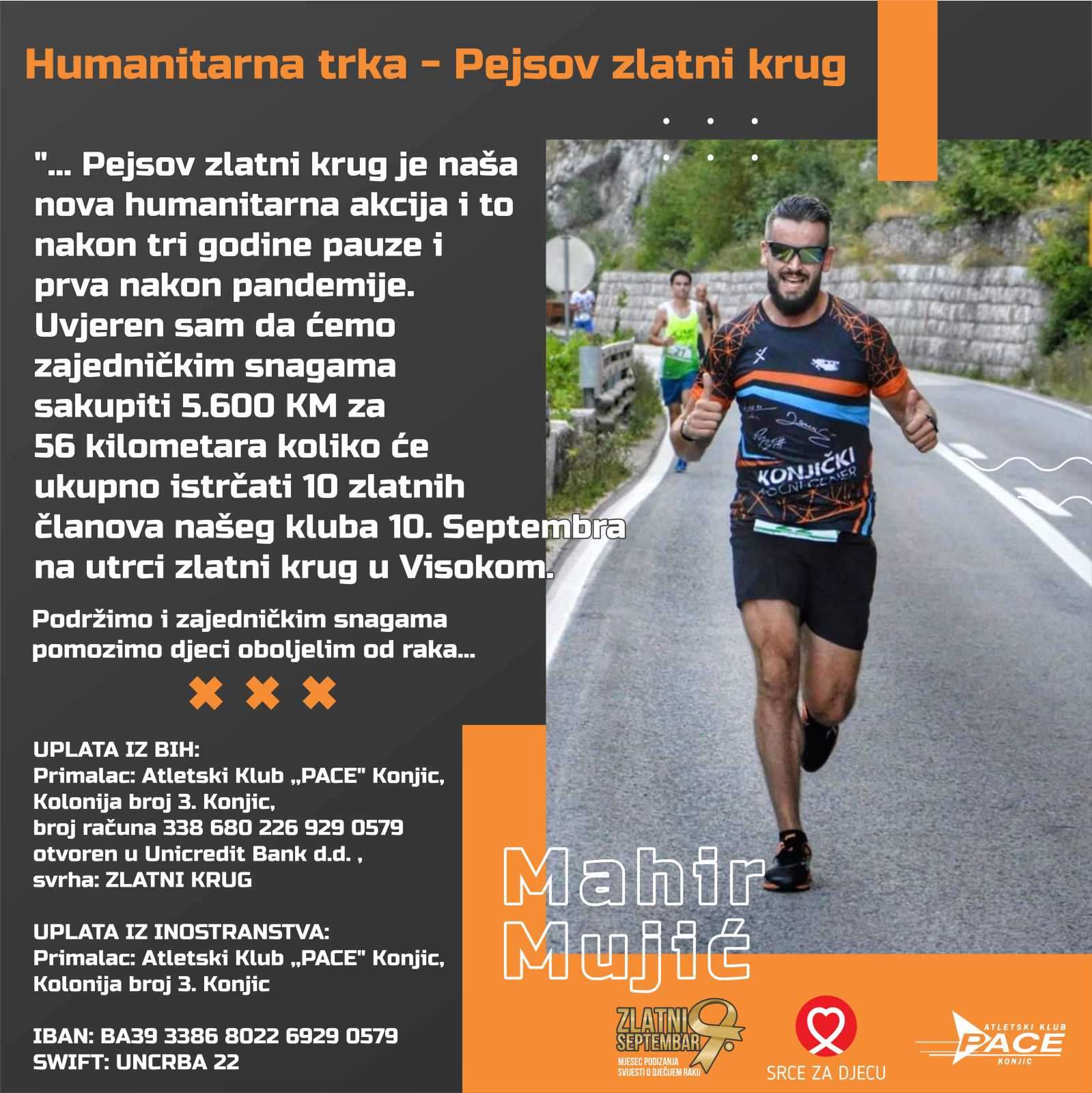 "Pejsov zlatni krug je naša nova humanitarna akcija i to nakon tri godine pauze i prva nakon pandemije. Uvjeren sam da ćemo zajedničkim snagama skupiti 5.600 KM za 56 kilometara koliko će ukupno istrčati 10 zlatnih članova našeg kluba. Uzbuđenje za utrku ne može se opisati riječima, a svrha je duboko ukorijenjena u plemenitom cilju - pomoći djeci koja se bore s teškom bolešću”, izjavio je Mahir Mujić.