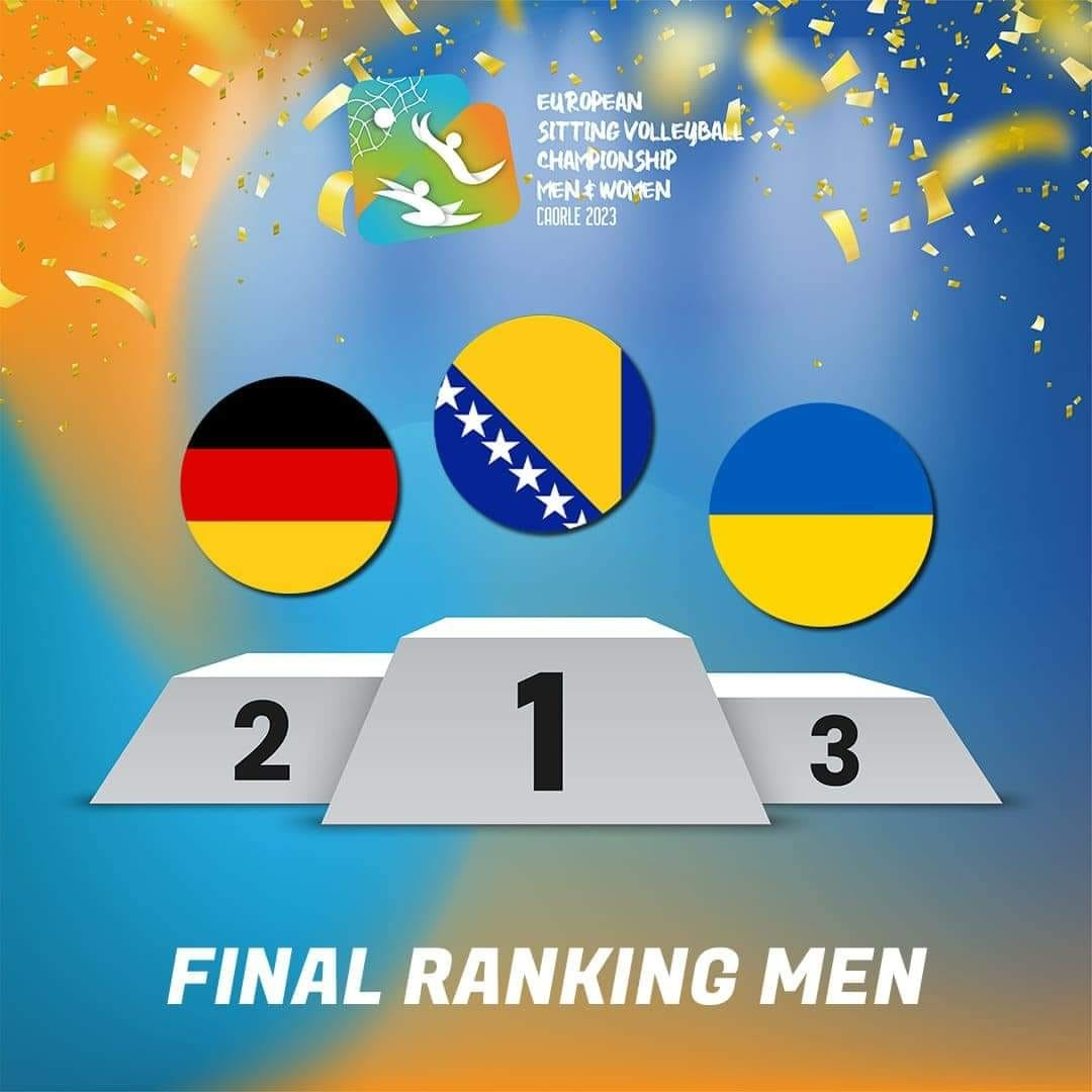 Reprezentacija Bosne i Hercegovine u sjedećoj odbojci je slavila u finalu Evropskog prvenstva protiv Njemačke rezultatom 3:2, po setovima 18:25, 25:23, 28:30, 25:21, 15:6 i tako osvojili novo zlato.