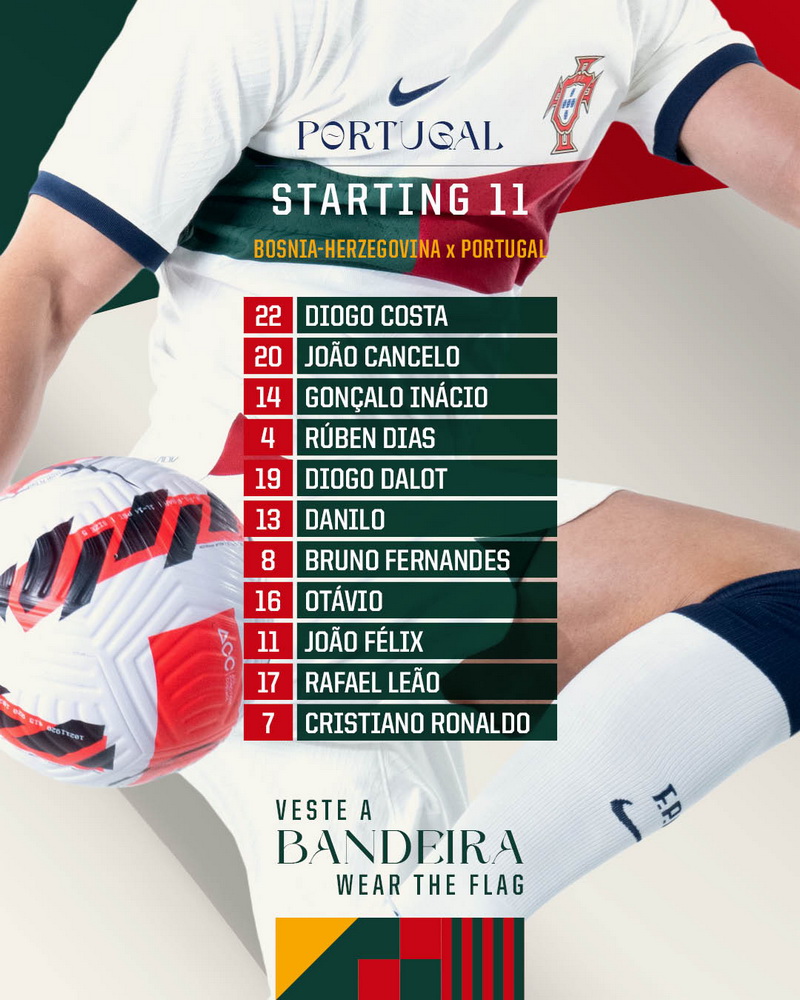 Diogo Costa, Dalot, Ruben Dias, Inacio, Cancelo; Danilo, Otavio, Bruno, Rafel Leao, Joao Felix; Ronaldo.