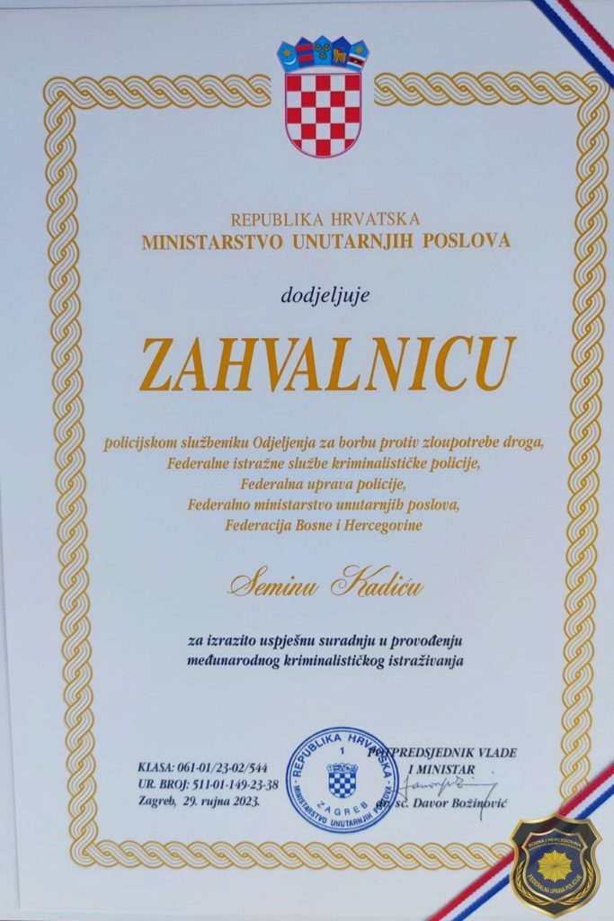 Dana, 18.10.2023. godine, policijski službenici Federalne uprave policije Muamer Ručić i Semin Kadić dobili su priznanje od Ministarstva unutrašnjih poslova Republike Hrvatske na svečanosti održanoj u Zagrebu povodom Dana policije Republike Hrvatske.