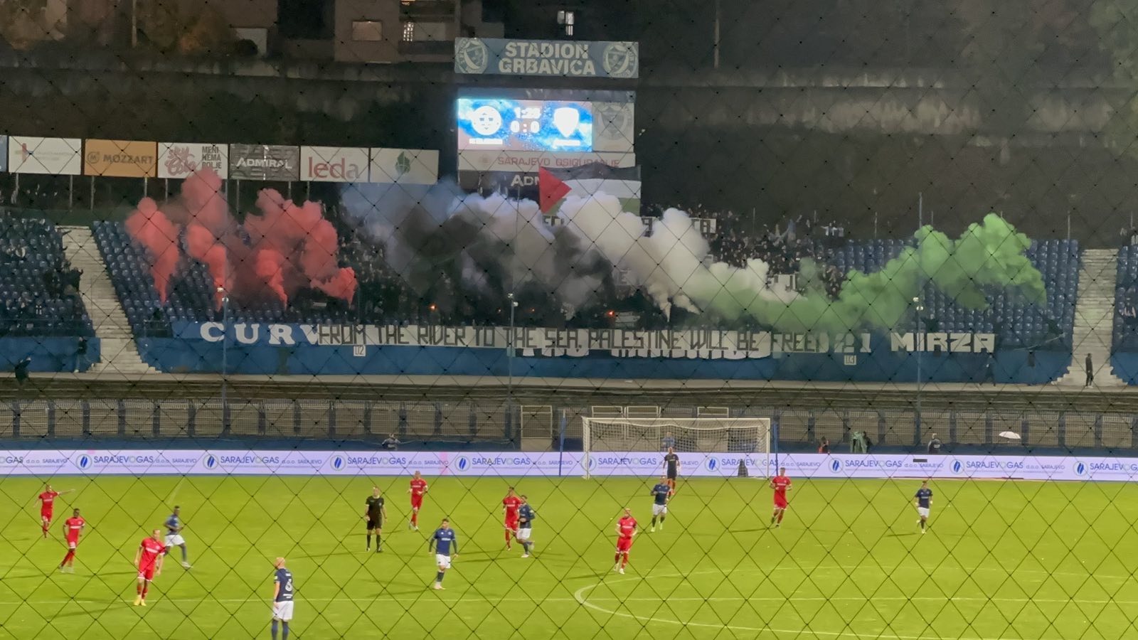 Potom su zapalili i baklje u bojama zastave Palestine, a sa tribine se orilo: Palestina, Palestina.