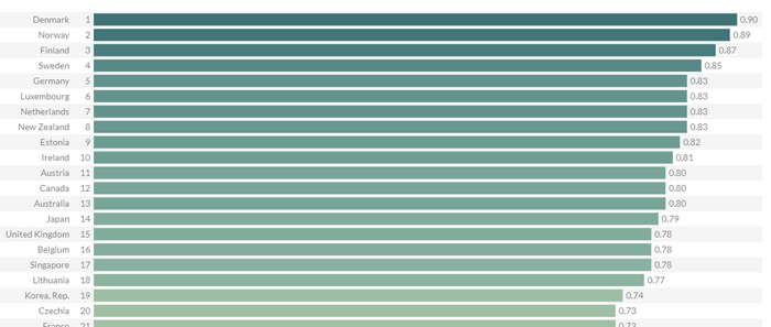 Danska je najbolje ocijenjena zemlja, skandinavske zemlje su također među najbolje ocijenjenim, to jeste Norveška, Danska i Švedska. Zatim slijede Njemačka, Luksemburg, Holandija, Novi Zeland, Estonija i Island.