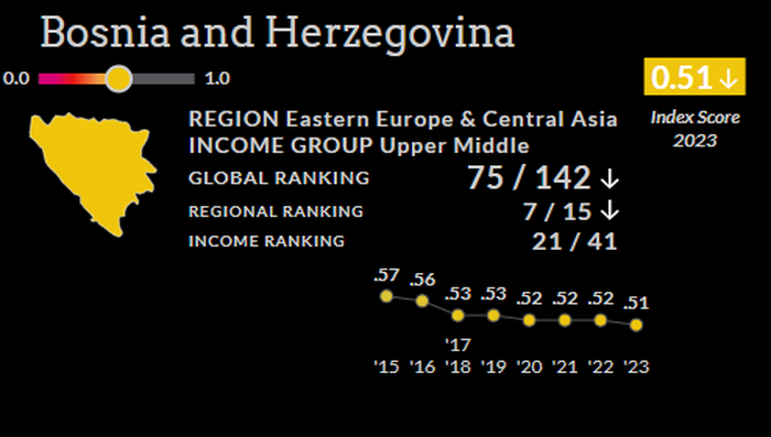 Bosna i Hercegovina se nalazi na 75. mjestu, ispred nas su Mađarska i Panama, dok su iza nas Gvajana, Šir Lanka i Indija. Također Bosna i Hercegovina, bilježi konstanti pad na pomenutoj listi. Od 2015. godine, kada se nalazila na 40. mjestu konstantno je padala, do sadašnje pozicije.