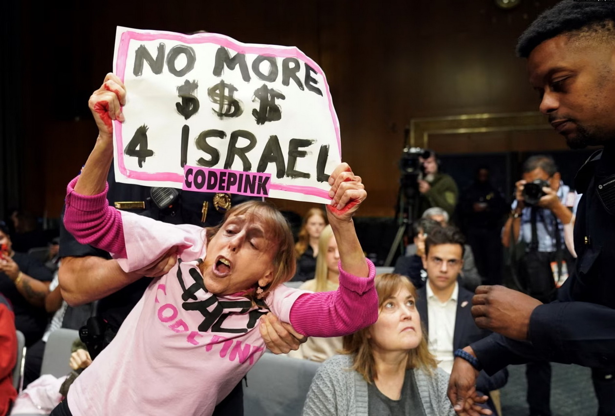 Policija Kongresa ih je uklonila iz sobe nakon što su počeli uzvikivati slogane "Primirje odmah!", "Zaštitite djecu Gaze!", "Stop finansiranju genocida" i 'Palestinci nisu životinje'.