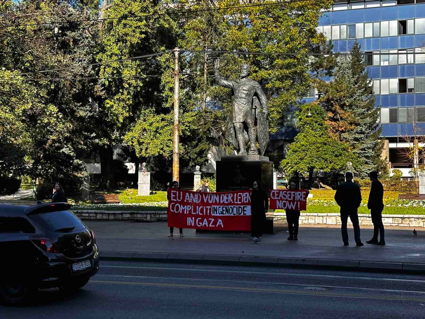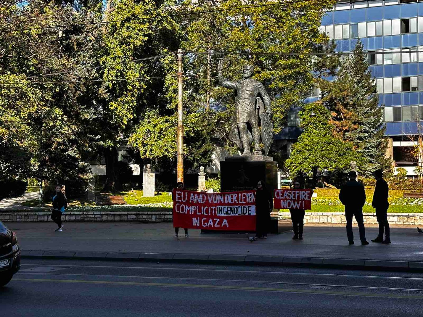 "EU i von der Leyen saučestvuju u genocidu u Gazi " i "Prekinuti vatru odmah".